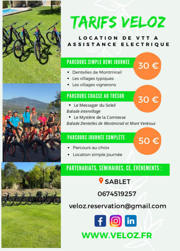 Installé dans le charmant village de Sablet, au pied des majestueuses Dentelles de Montmirail, Veloz propose des VTT à assistance électrique puissants et confortables. Que vous soyez débutant ou cycliste confirmé, c’est l’endroit rêvé pour une aventure au cœur du Vaucluse.