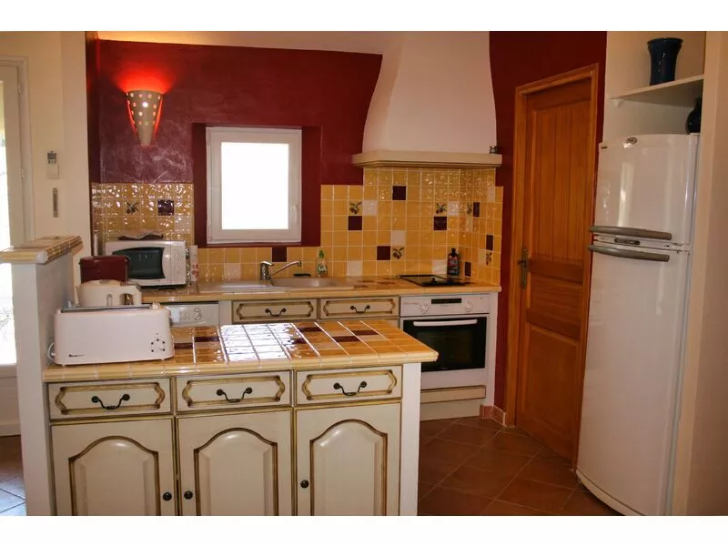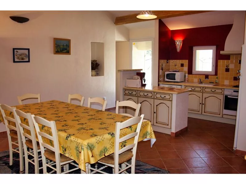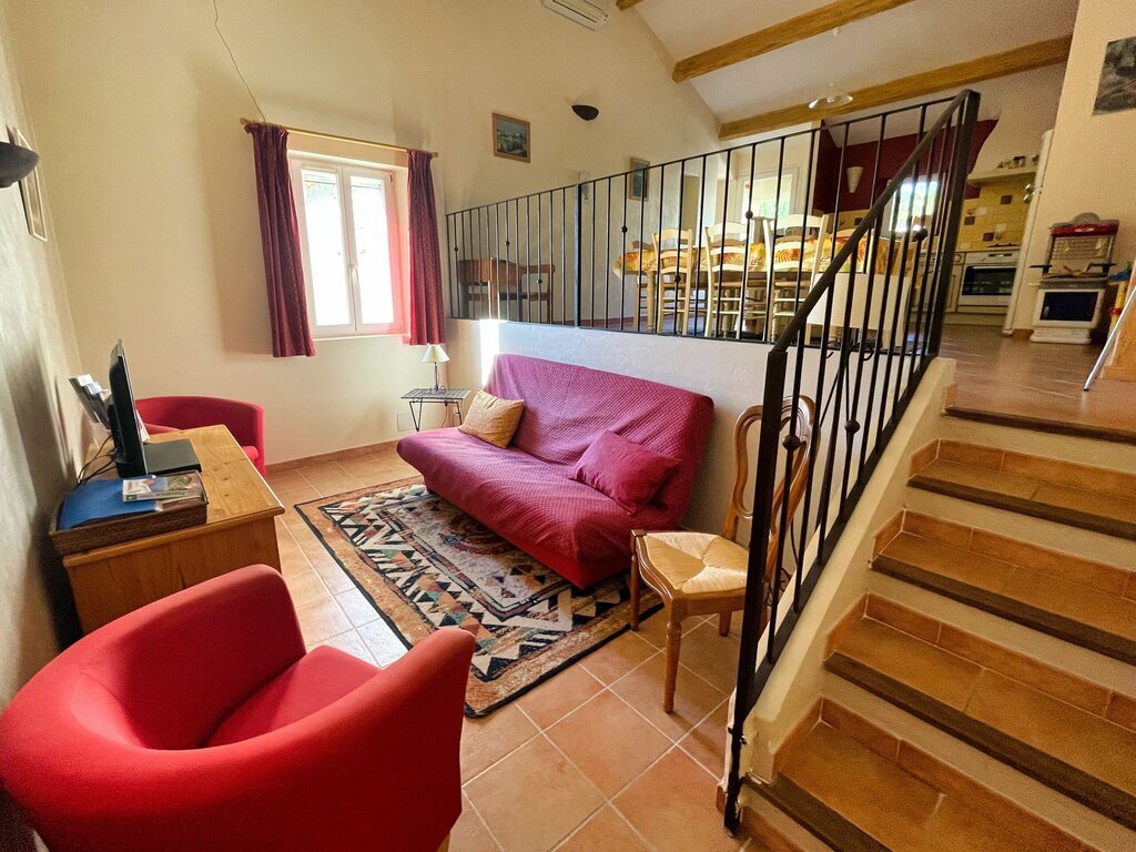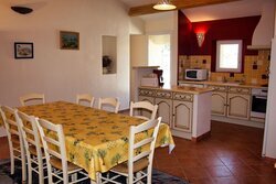 La villa est entièrement climatisée. La décoration est charmante et de style provençal. Il y a un dénivelé de cinq marches entre la salle à manger et le salon.
