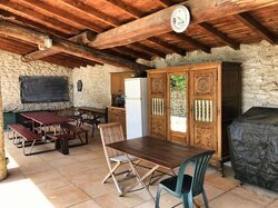 Juste à côté du gîte se trouve une terrasse partiellement couverte par une pergola en toile. La terrasse est équipée de suffisamment de mobilier de jardin pour dîner confortablement en plein air.