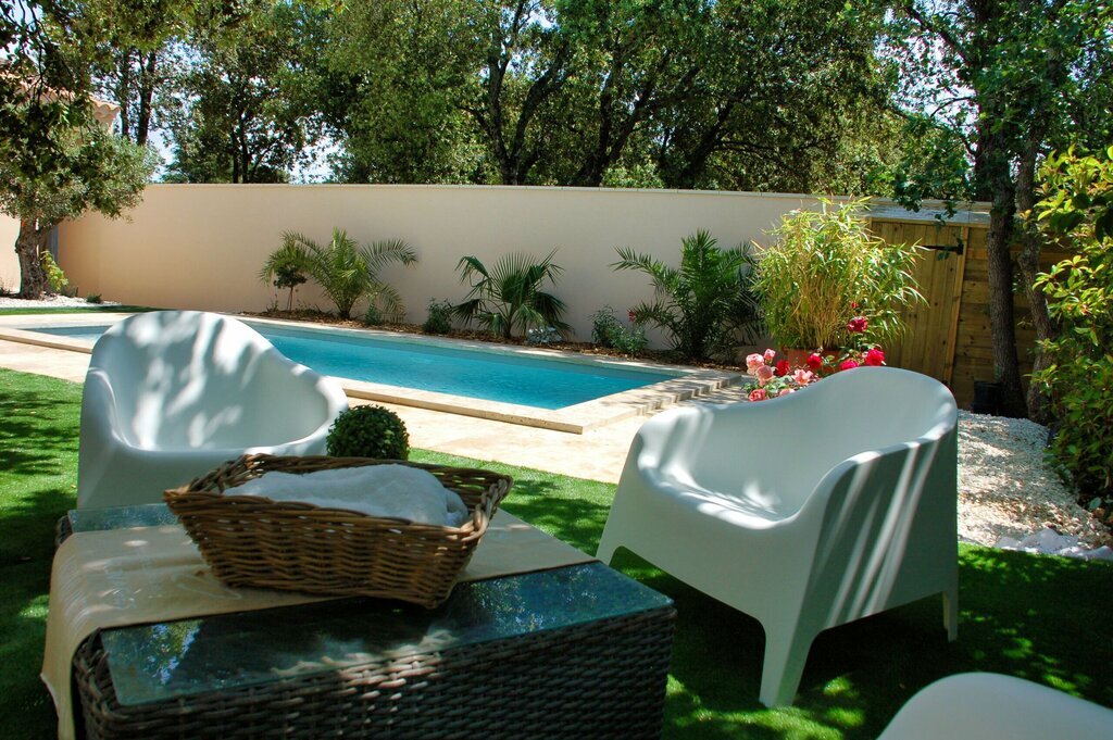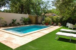 La piscine est revêtue de travertin. A côté de la piscine se trouve une aire de bronzage en gazon artificiel, agréable pour les pieds. Quatre chaises longues sont disponibles.