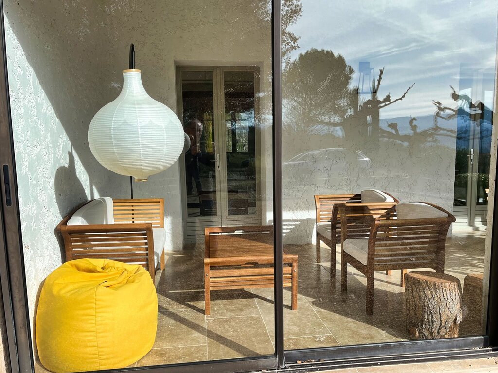 Adjacente à la villa, une terrasse couverte, meublée de mobilier de jardin confortable, est idéale pour les repas en plein air.