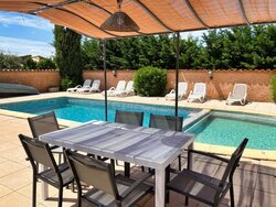 Elle est équipée d'un mobilier de jardin pour dîner confortablement à l'extérieur, complété par un salon/lounge de jardin.