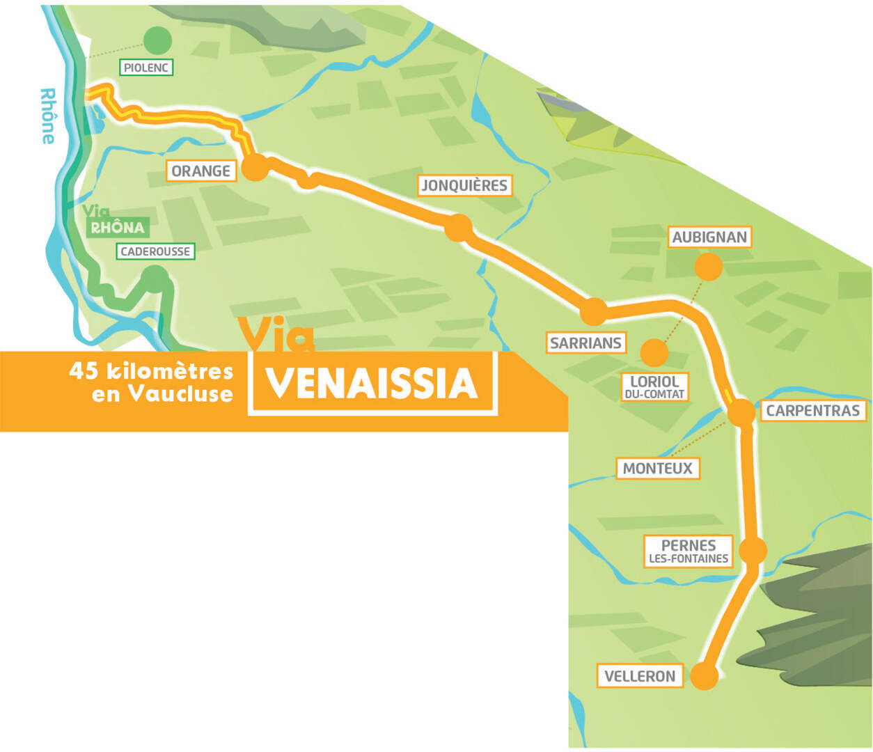 De Via Venaissia is een aantrekkelijke fietsroute van ongeveer 45 kilometer, die start in Orange en eindigt in Velleron, met onder meer tussenstops in Jonquières, Sarrians, Loriol-du-Comtat, Carpentras en Pernes-les-Fontaines.