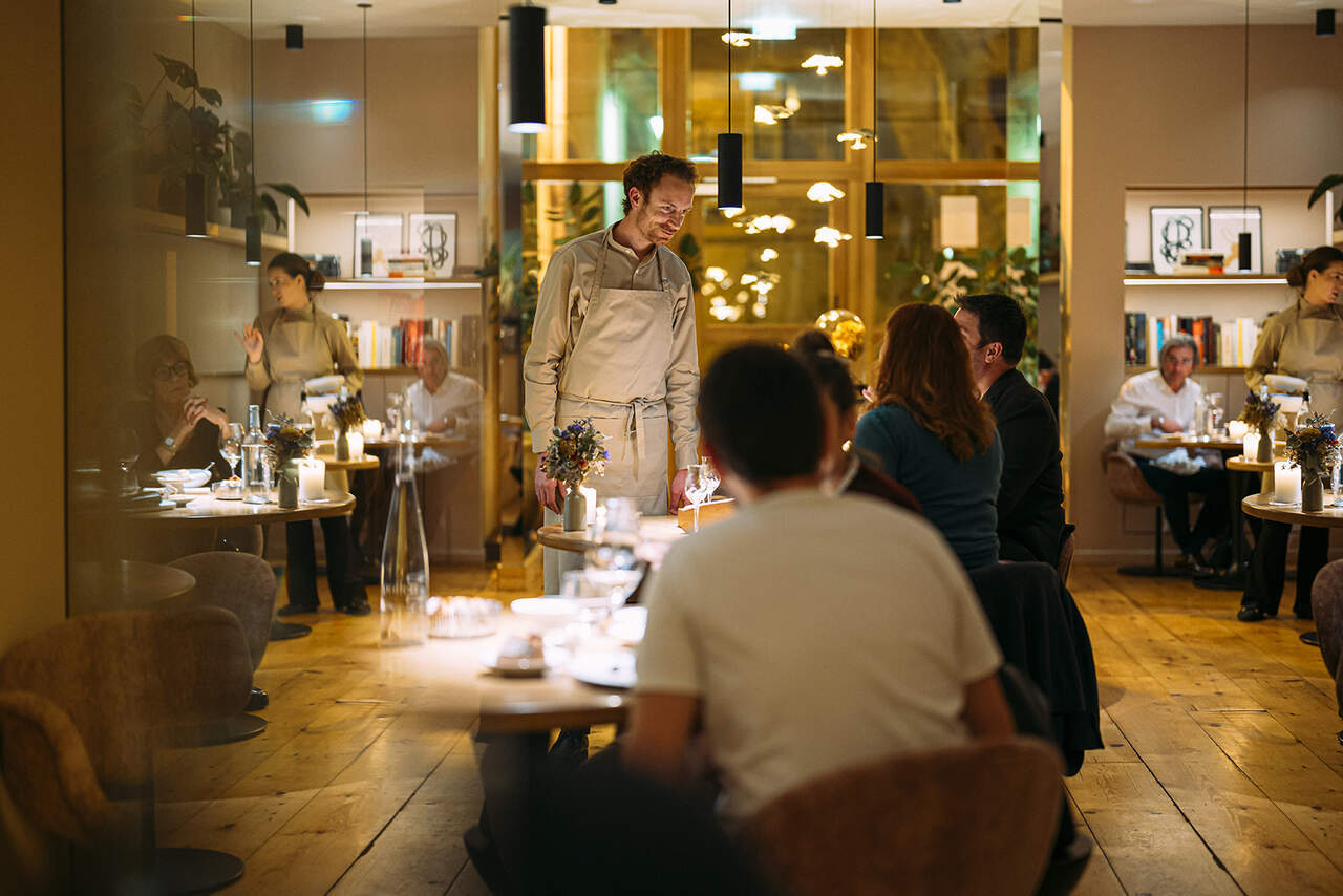 De sfeer is stijlvol maar ontspannen. In de open keuken kan je zien hoe het team te werk gaat, en de bediening neemt de tijd om elk gerecht kort toe te lichten. De wijnsuggesties zijn zorgvuldig gekozen en focussen op biologische en biodynamische wijnen.