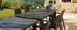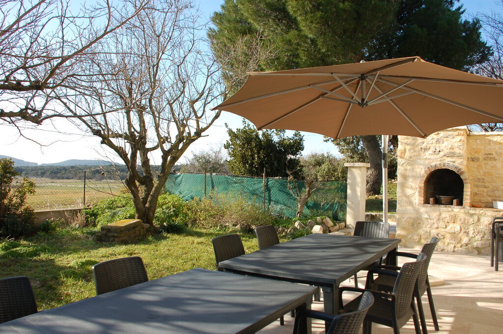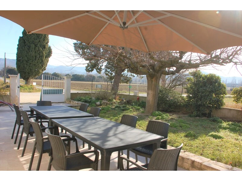 Aanpalend aan de Mas is een ruim terras voorzien van tuinmeubilair en een grote parasol.