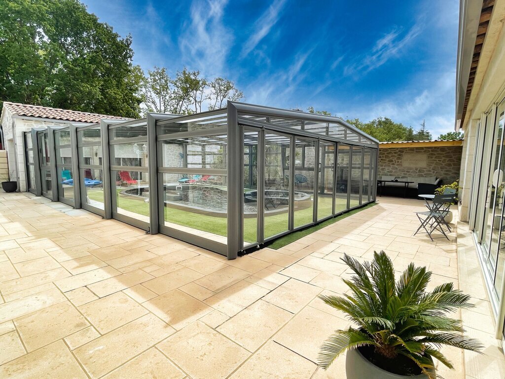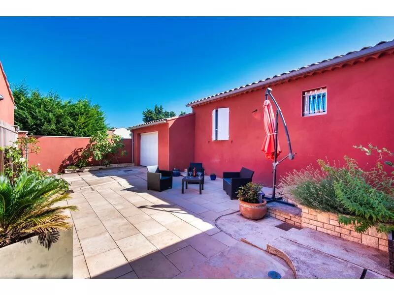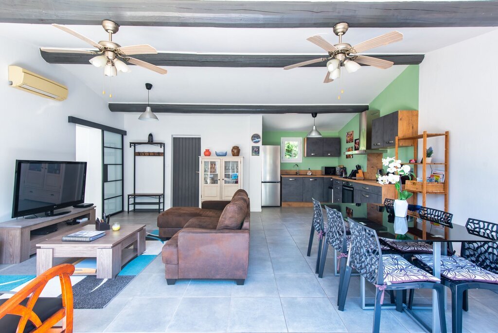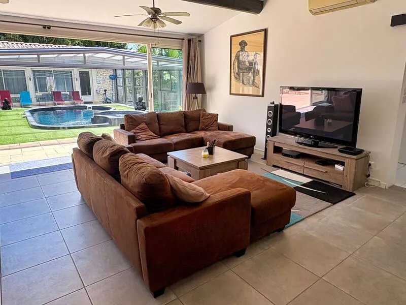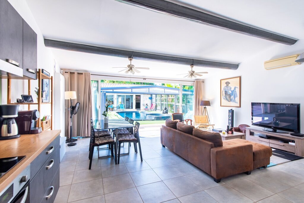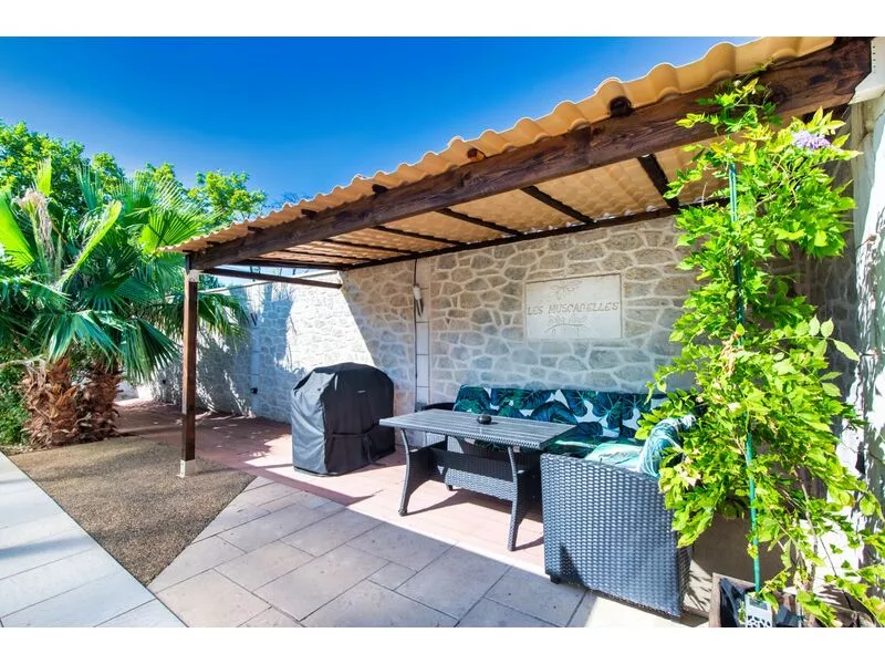 Aanpalend aan de villa bevindt zich een ruim terras, deels overdekt met een rieten pergola.