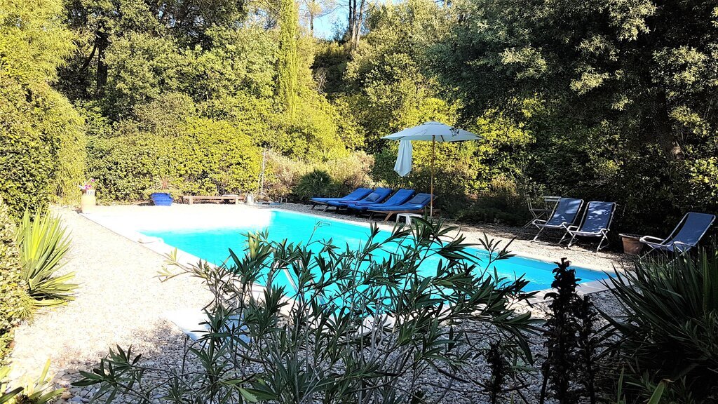 Voor de zonnekloppers is er voldoende ruimte aan het zwembad. Het terrein ligt in helling met het zwembad een niveau lager dan de woning.