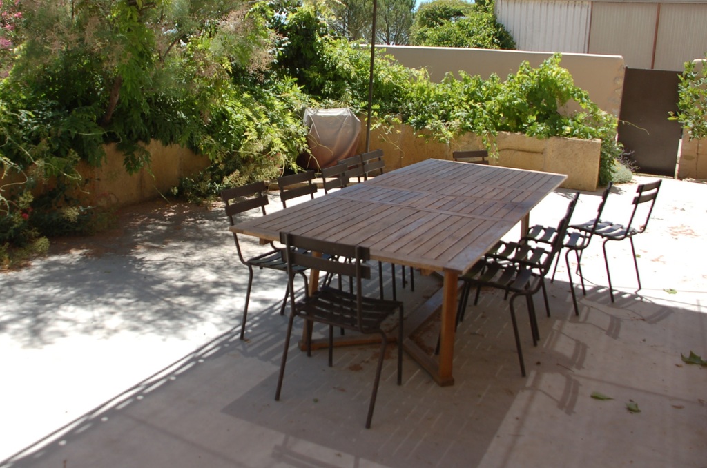 Aanpalend aan de woning is een groot terras met een riet-gedekte pergola. Hier is het heerlijk vertoeven in de lommerte met zicht op het zwembad en de wijngaarden.