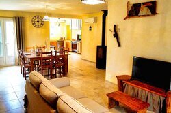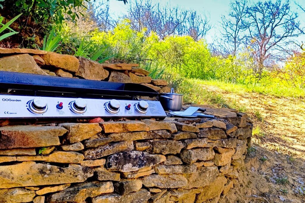 Dit terras is uitgerust met voldoende tuinmeubilair om comfortabel buiten te dineren, evenals een houtskoolbarbecue en een gasplancha.