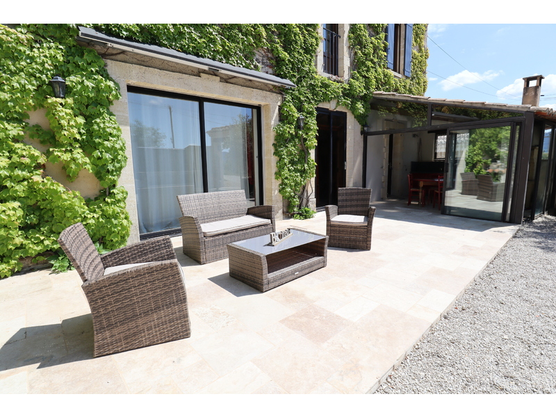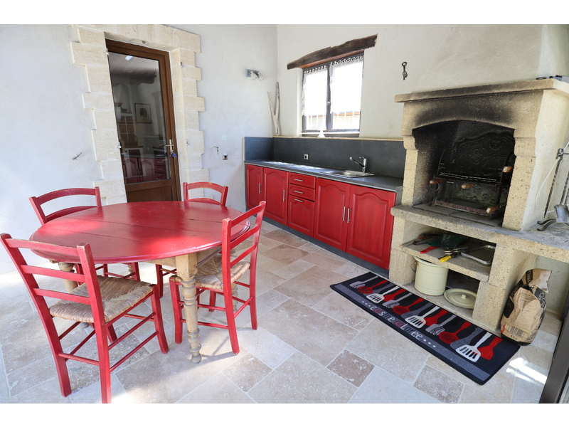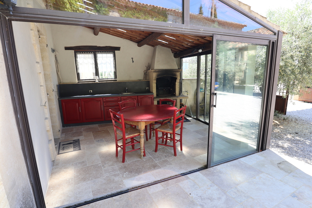 De veranda is uitgerust met een volwaardige buitenkeuken, die bijna volledig kan worden geopend. Deze buitenkeuken is voorzien van een gemetselde barbecue, een plancha voor het bereiden van diverse gerechten, en een spoelbak met werkblad, waardoor het een ideale ruimte is voor culinaire creaties aan de binnenkoer.