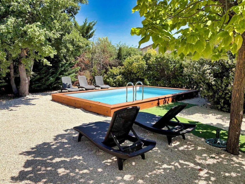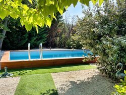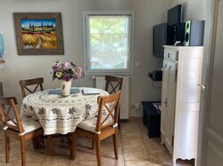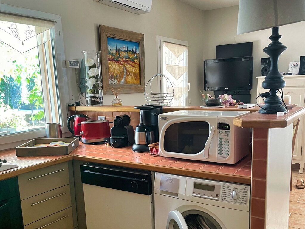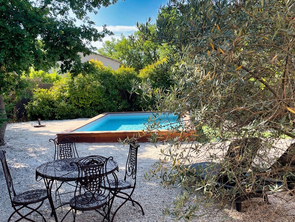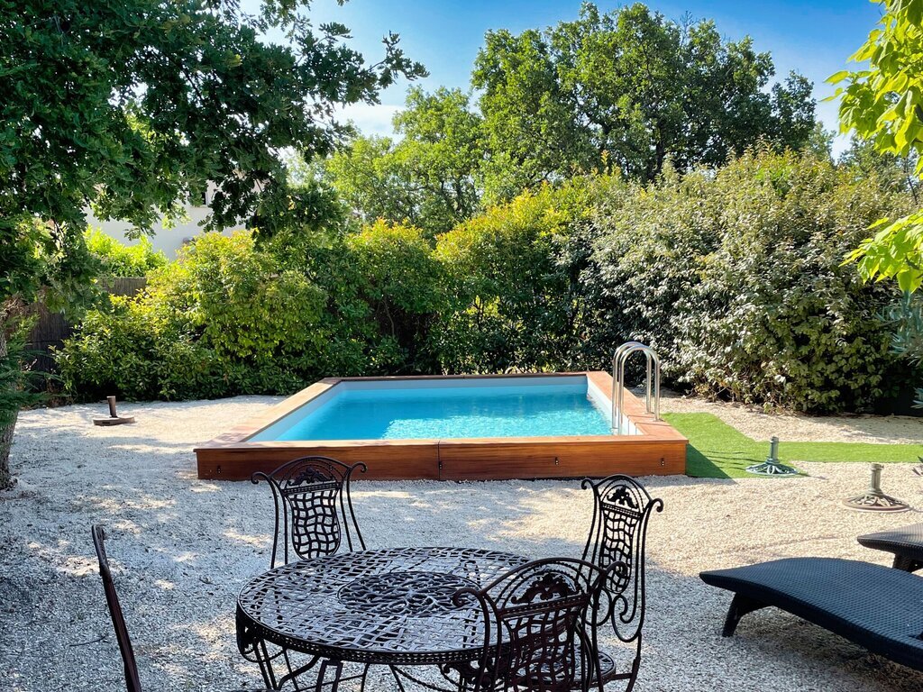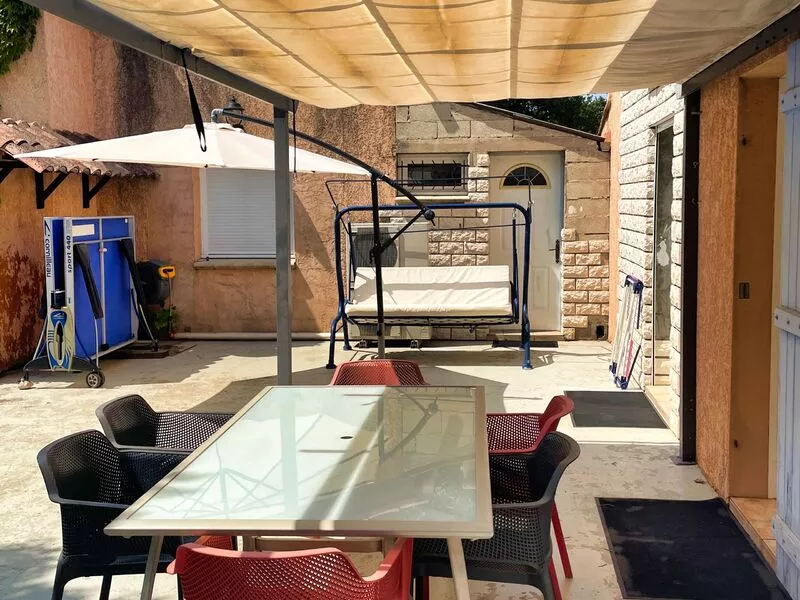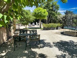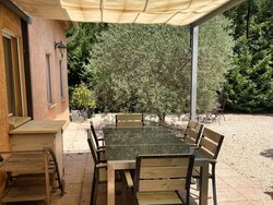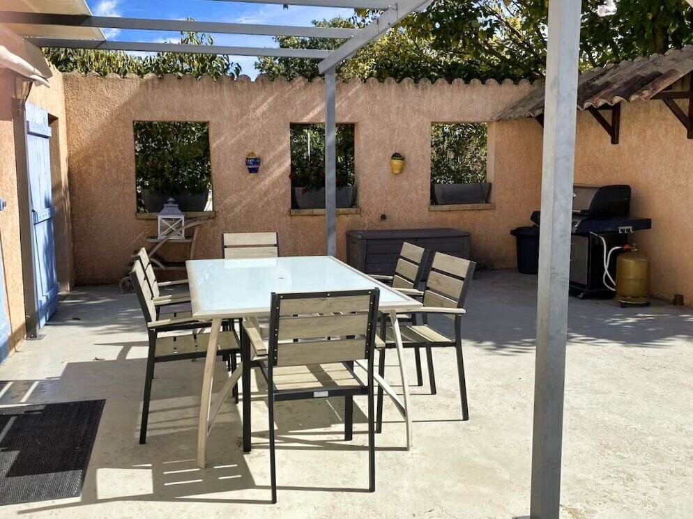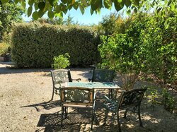 Aansluitend aan de gîte bevindt zich een gezellige patio, gedeeltelijk overdekt en uitgerust met een openschuifbare pergola met doek.