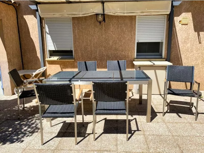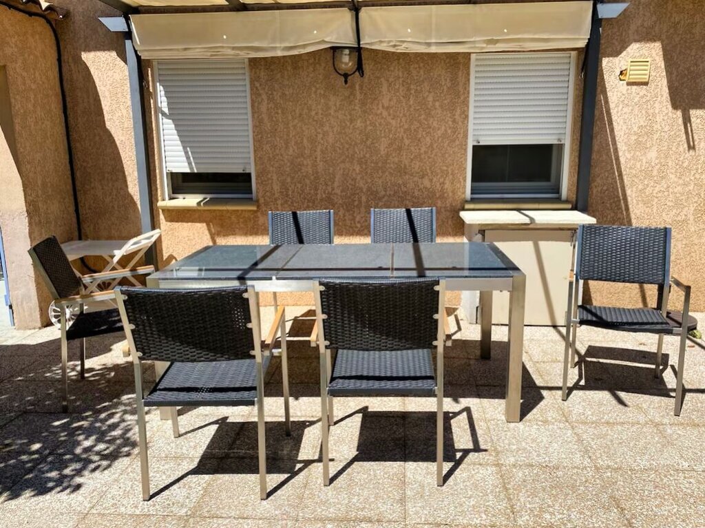 Het terras beschikt over ruim tuinmeubilair, ideaal om buiten te dineren.
