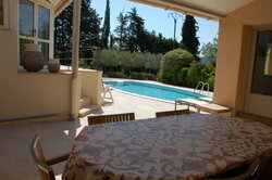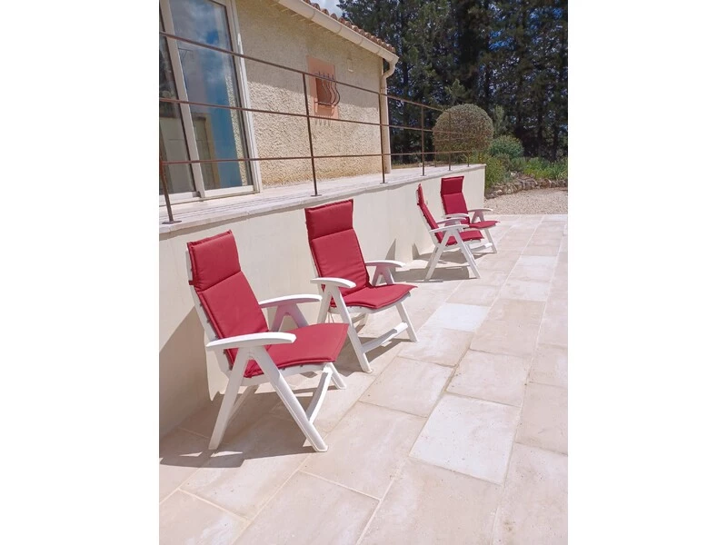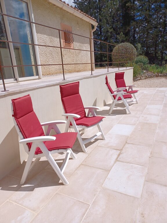 Het was gezellig en comfortabel toeven aan het zwembad op de vier degelijke metalen ligbedden en de vier hoge en verstelbare plastic tuinzetels, onder een van de beide parasols. Wat ons geweldig meeviel, was de absolute rust: je hoorde er werkelijk niéts (behalve het tsjirpen van de cicaden dan).